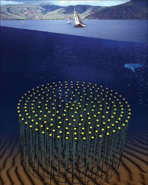 Each string of sensors is carefully coiled onto a spool aboard a ship. Divers and remotely operated vehicles guide the modules into position as they are lowered to the seafloor. Once anchored, an acoustic signal releases floats that raise the line upright, forming a luminous vertical array in the darkness.